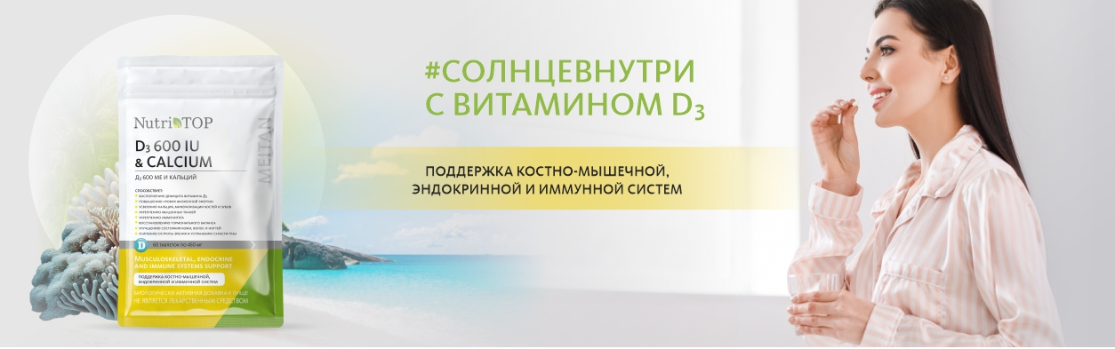 Сейчас в серии NutriTOP появилась новинка D3 600 IU & Calcium — высокоэффективный комплекс холекальциферола (витамин D3) с коралловым кальцием из Окинавы (Япония) и термофильным стрептококком.