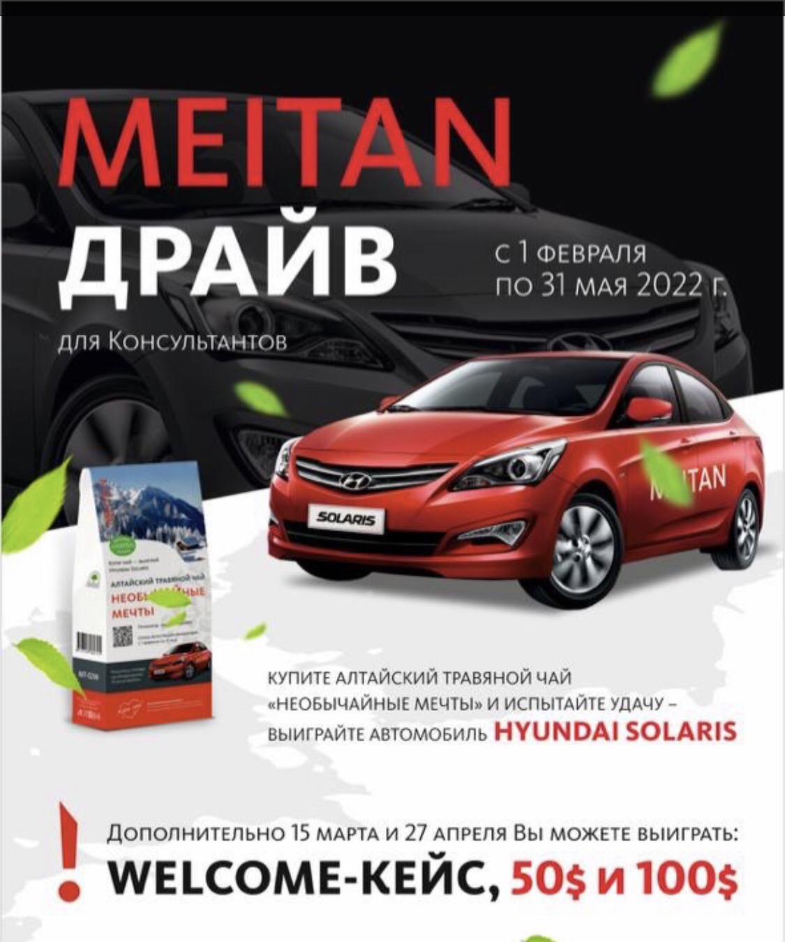 Итоги розыгрыша мы подведем в июне на Дне рождения Компании МейТан. Но тянуть с закупкой чая до лета не стоит: будет два промежуточных розыгрыша, 15 марта и 27 апреля! На них мы разыграем долларовые премии и наши замечательные Welcome-кейсы.