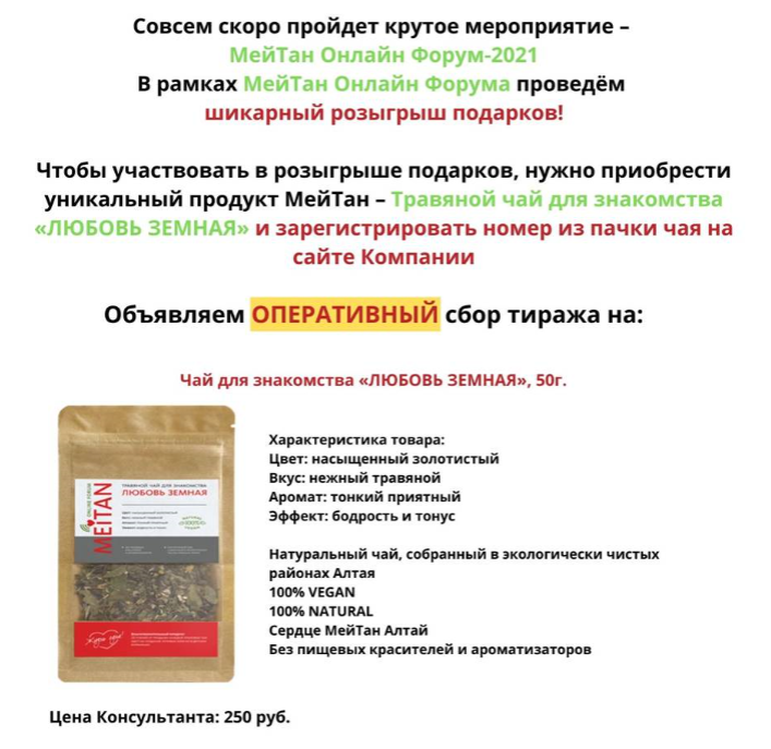 Чтобы участвовать в розыгрыше подарков, нужно приобрести новинку МейТан – Травяной чай для знакомства «ЛЮБОВЬ ЗЕМНАЯ» и зарегистрировать номер из пачки чая на сайте Компании.